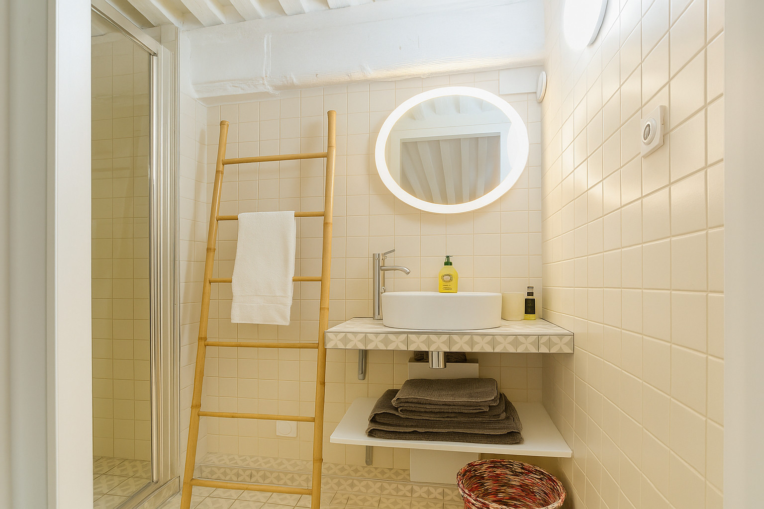 - Mirror, storage unit, towel radiator, hairdryer