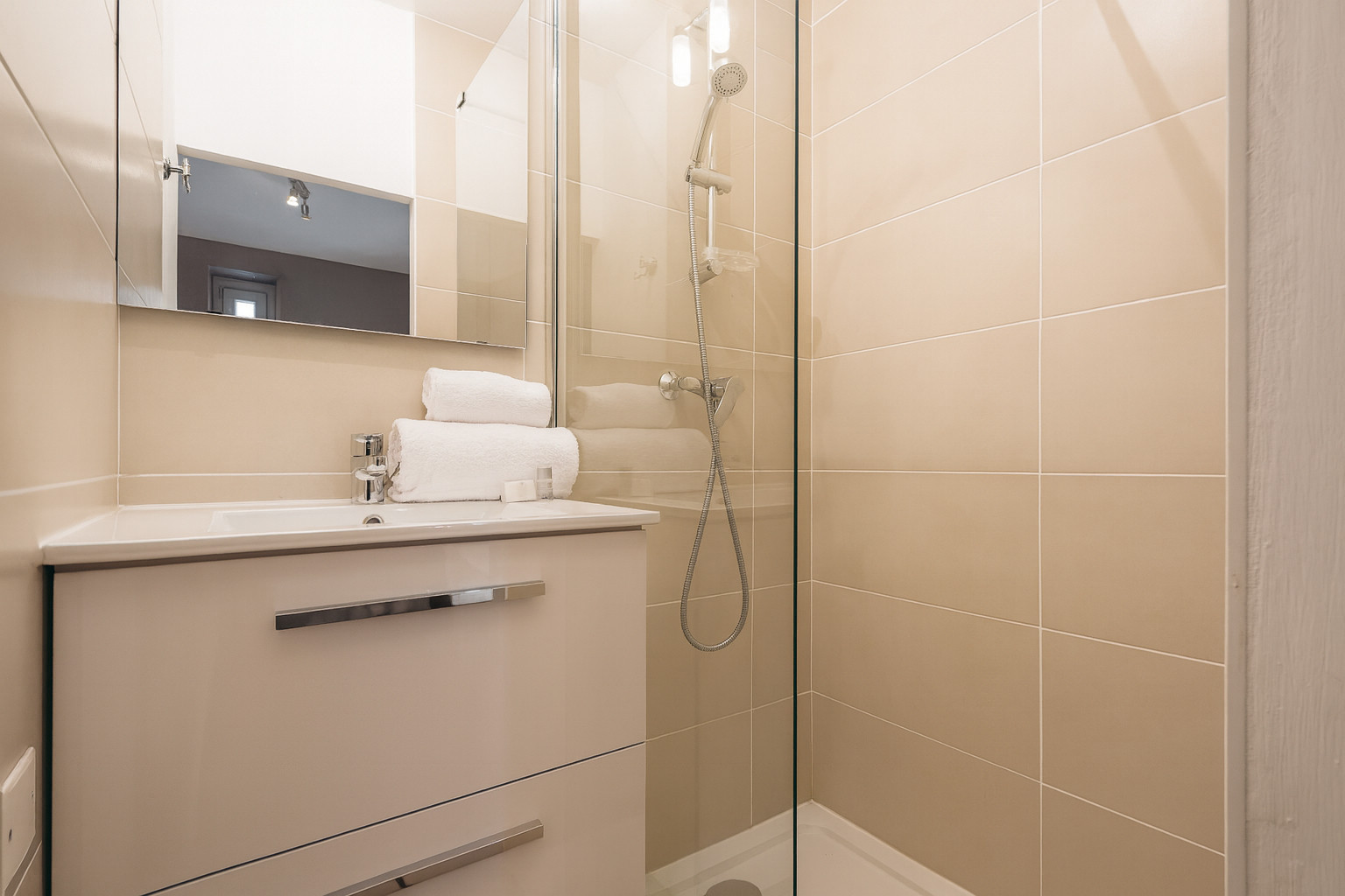 - Miroir, meuble de rangement, sèche-serviettes, sèche-cheveux