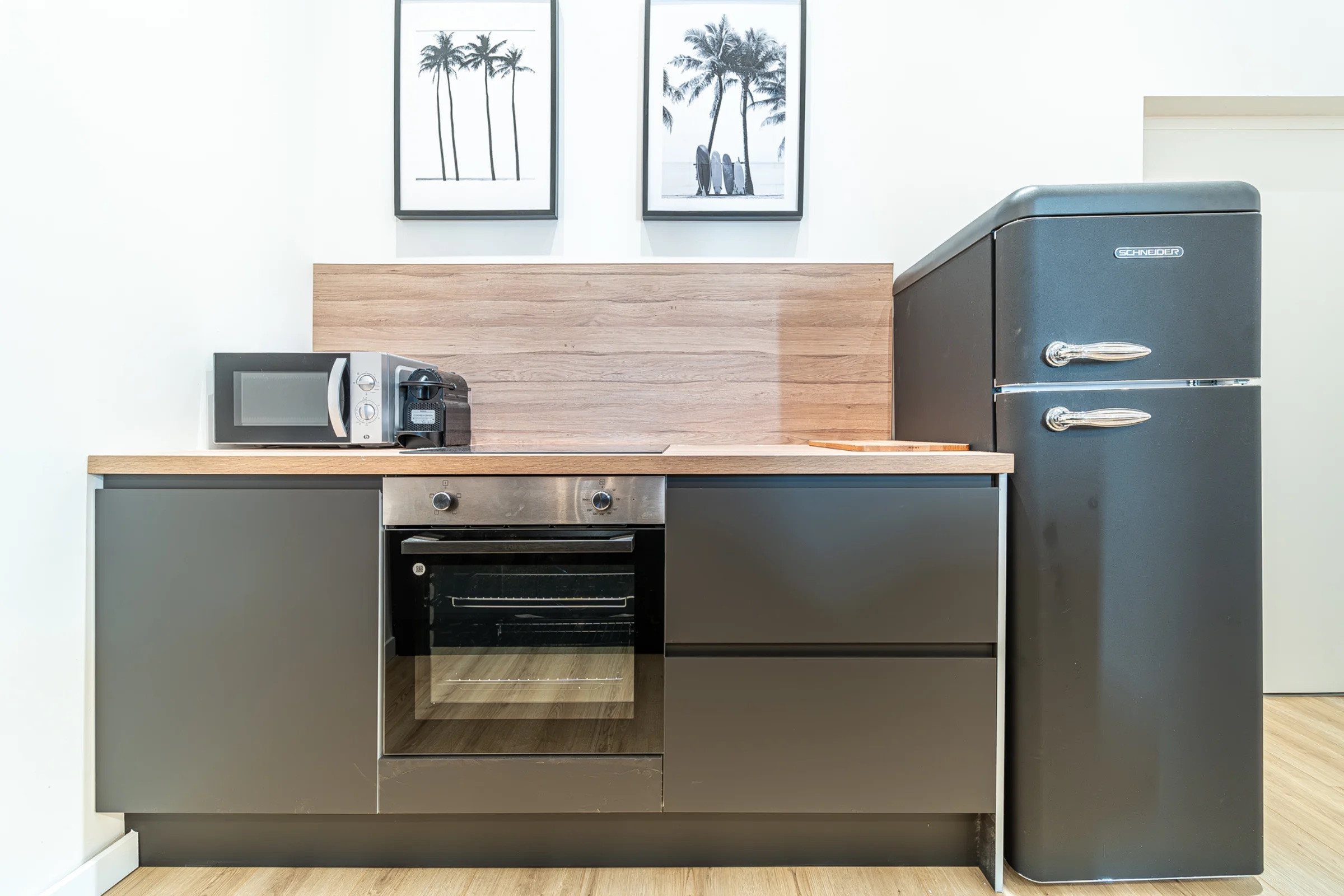 - Cuisine ouverte équipée : four, plaques, réfrigérateur/congélateur, lave-vaisselle, Nespresso, bouilloire, grille-pain, vaisselle et ustensiles